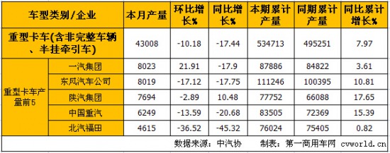 8月份重型卡車(含非完整車輛、半掛牽引車)產(chǎn)量前5的企業(yè)依次為:一汽集團(tuán)(8023輛)、東風(fēng)汽車公司(8019輛)、陜汽集團(tuán)(7694輛)、中國(guó)重汽(6249輛)和北汽福田(4615輛),5家合計(jì)生產(chǎn)34600輛,占重型卡車(含非完整車輛、半掛牽引車)8月總產(chǎn)量43008輛的80.45%。由上表可見,環(huán)比上月,重卡產(chǎn)量前5名的企業(yè)僅有一汽集團(tuán)一家實(shí)現(xiàn)正增長(zhǎng),一汽也因此坐上產(chǎn)量月度第一的“寶座”。與去年同期相比,僅有陜汽(10.48%)一家企業(yè)實(shí)現(xiàn)正增長(zhǎng)。